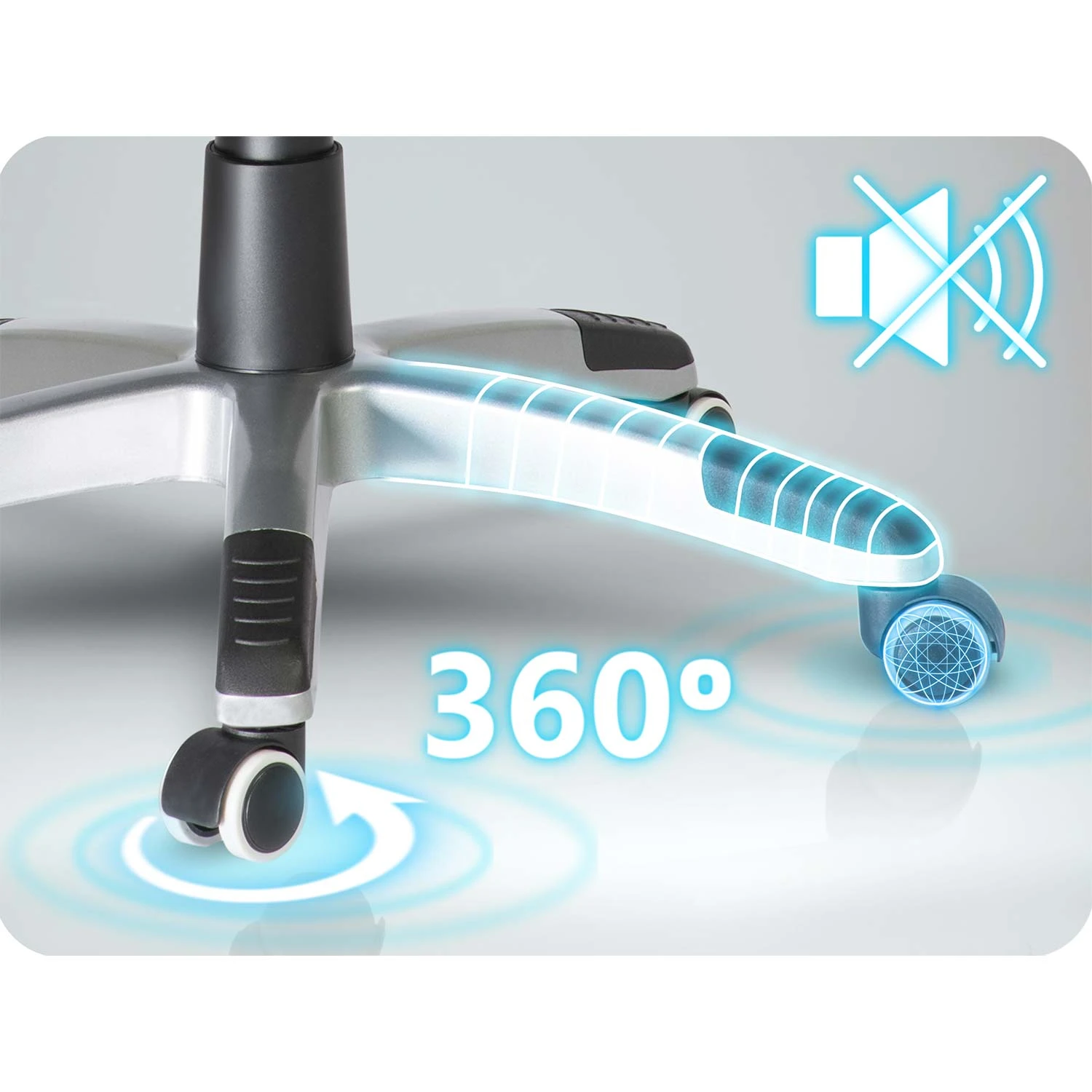 Ciche, powlekane kółka 360° umożliwiają płynne przesuwanie bez hałasu i bez zarysowań podłogi.