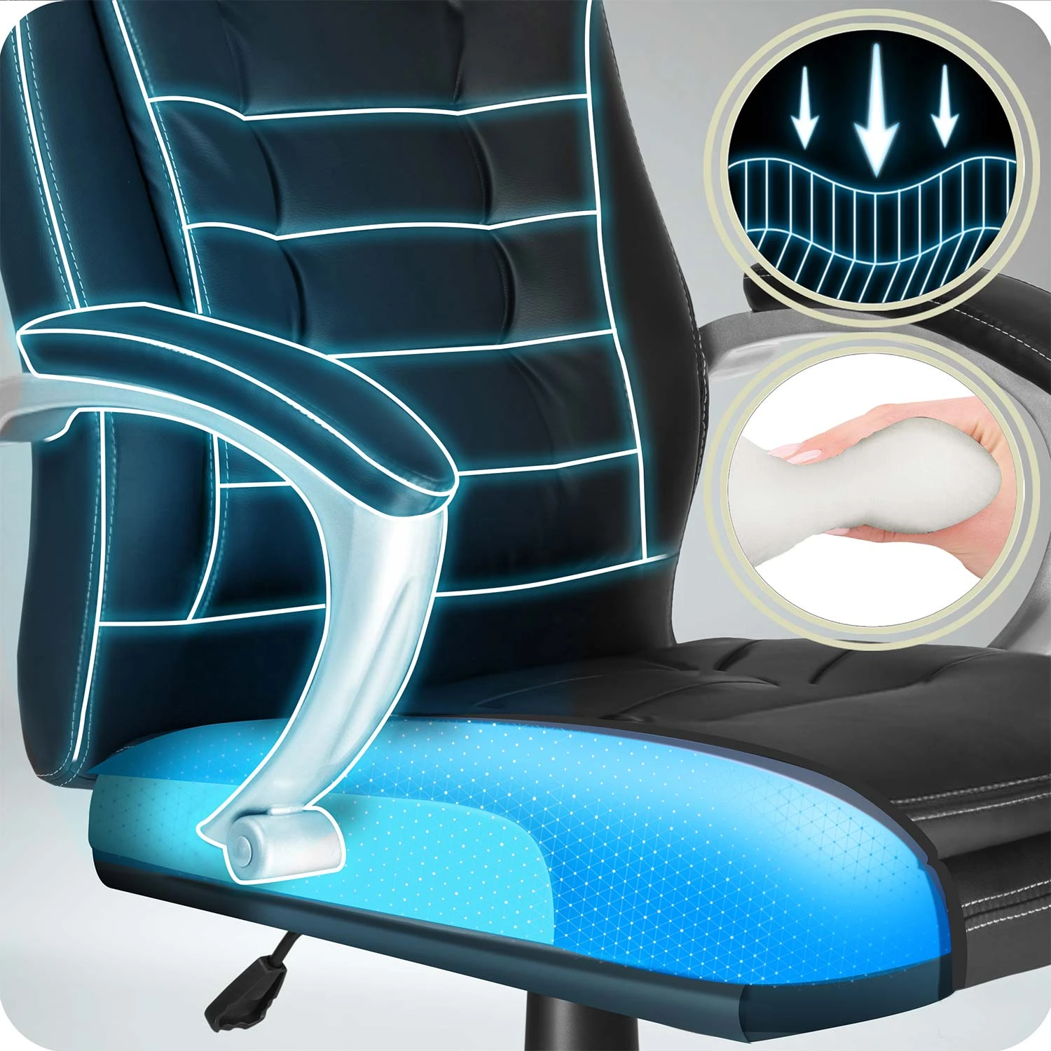 • Ergonomiczne wypełnienie idealnie dopasowuje się do ciała, równomiernie rozkładając nacisk i odciążając plecy podczas całego dnia.