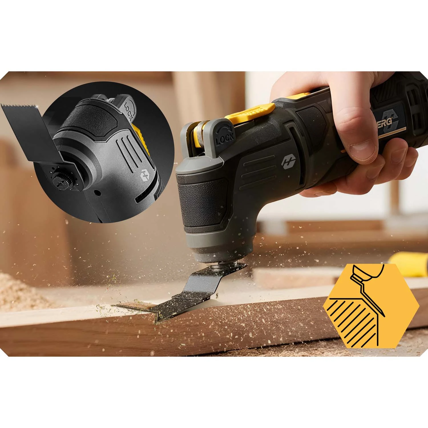 Multiszlifierka została wyposażona w ergonomiczny, antypoślizgowy uchwyt, który zapewnia pewny chwyt i pełną kontrolę nad narzędziem podczas cięcia. Dzięki niemu praca jest wygodna, bezpieczna i precyzyjna, nawet przy dłuższym użytkowaniu.