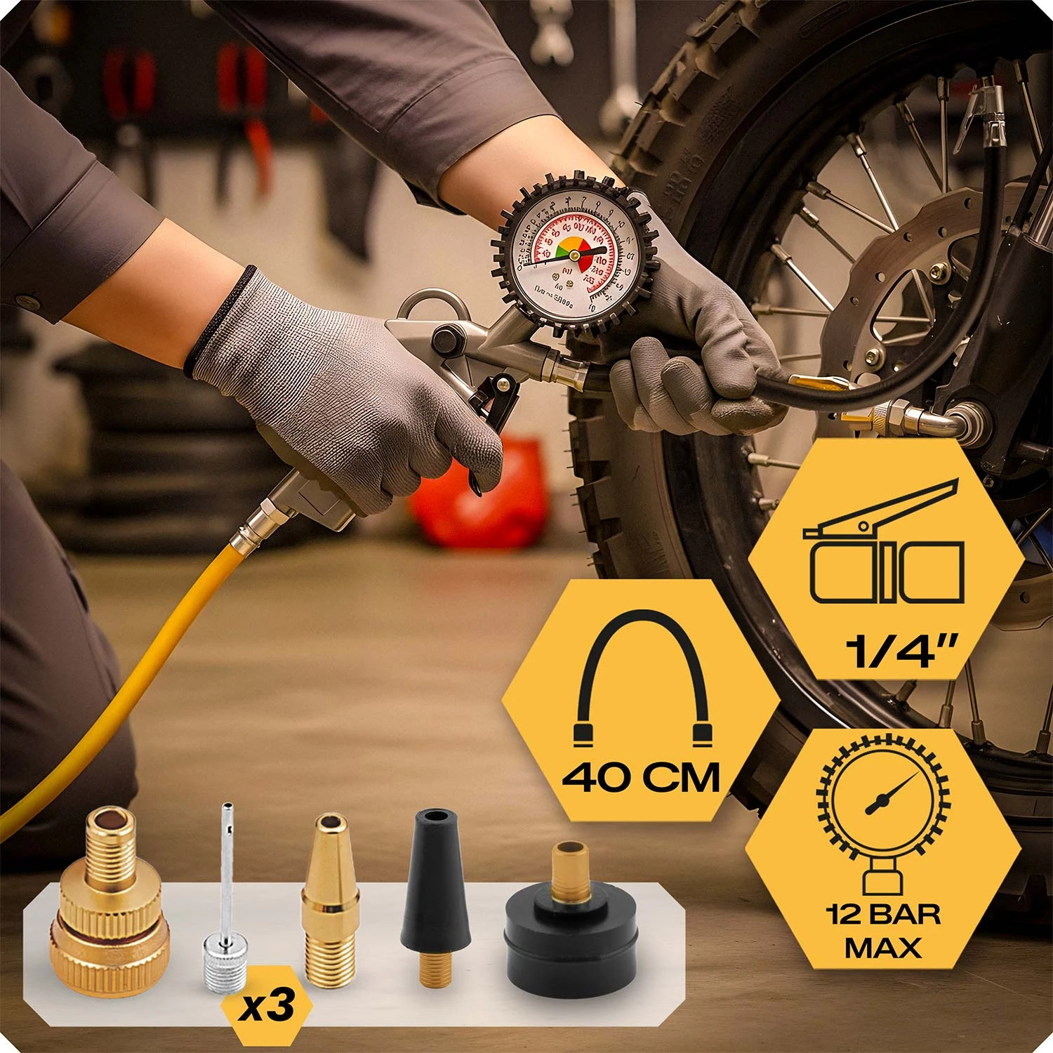 To niezastąpione narzędzie do obsługi kompresora! Solidny pistolet do pompowania z manometrem sprawdzi się idealnie zarówno w warsztacie, jak i w garażu. Wyposażony w: