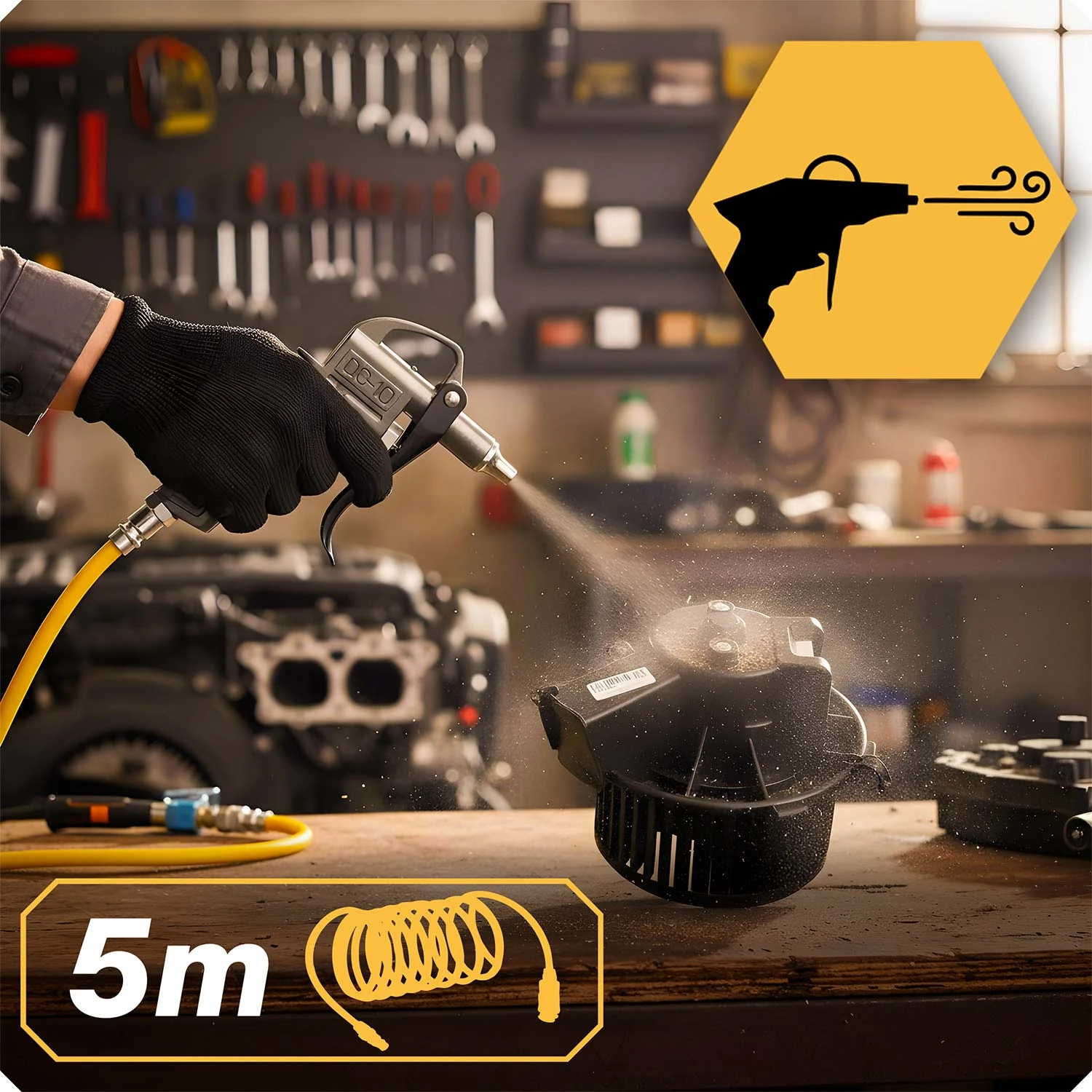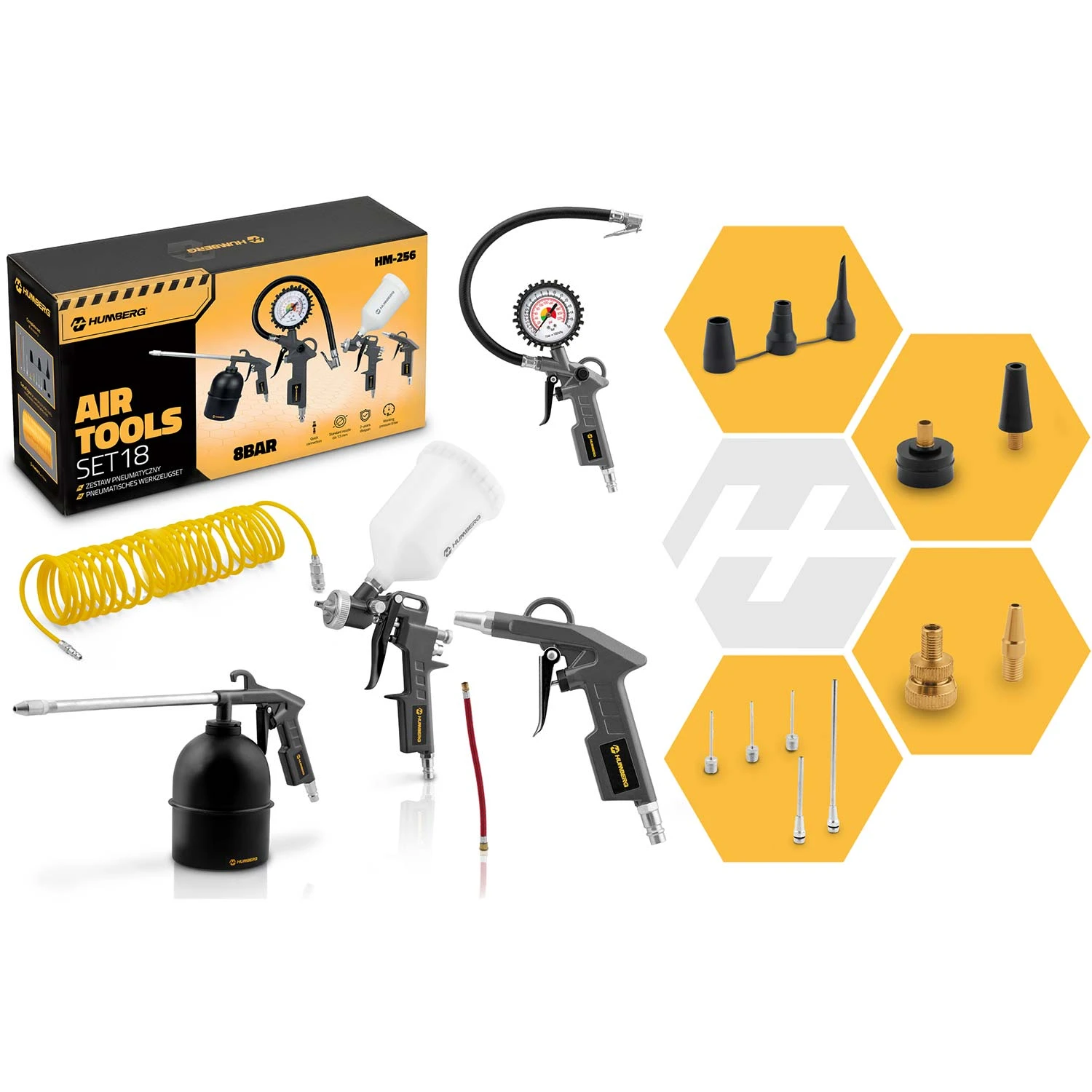 Znajdziesz tu: pistolety do malowania, pompowania, przedmuchiwania i mycia, wąż spiralny, końcówki do piłek, materacy i opon, adaptery, dysze i szybkozłączki – aż 18 elementów, które pozwolą Ci działać szybko, wygodnie i profesjonalnie.