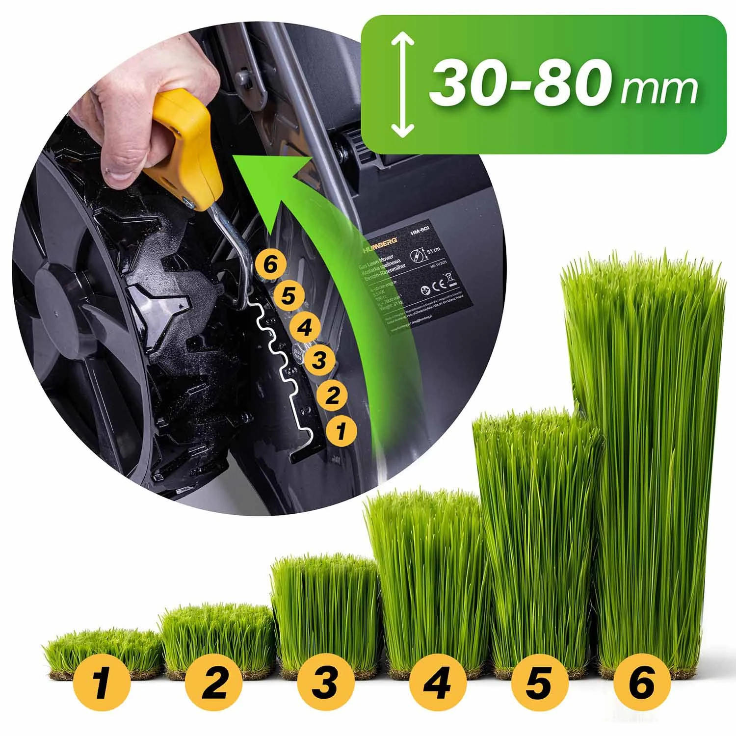 ✅ Centralna regulacja wysokości cięcia: 30–80 mm (6 poziomów)