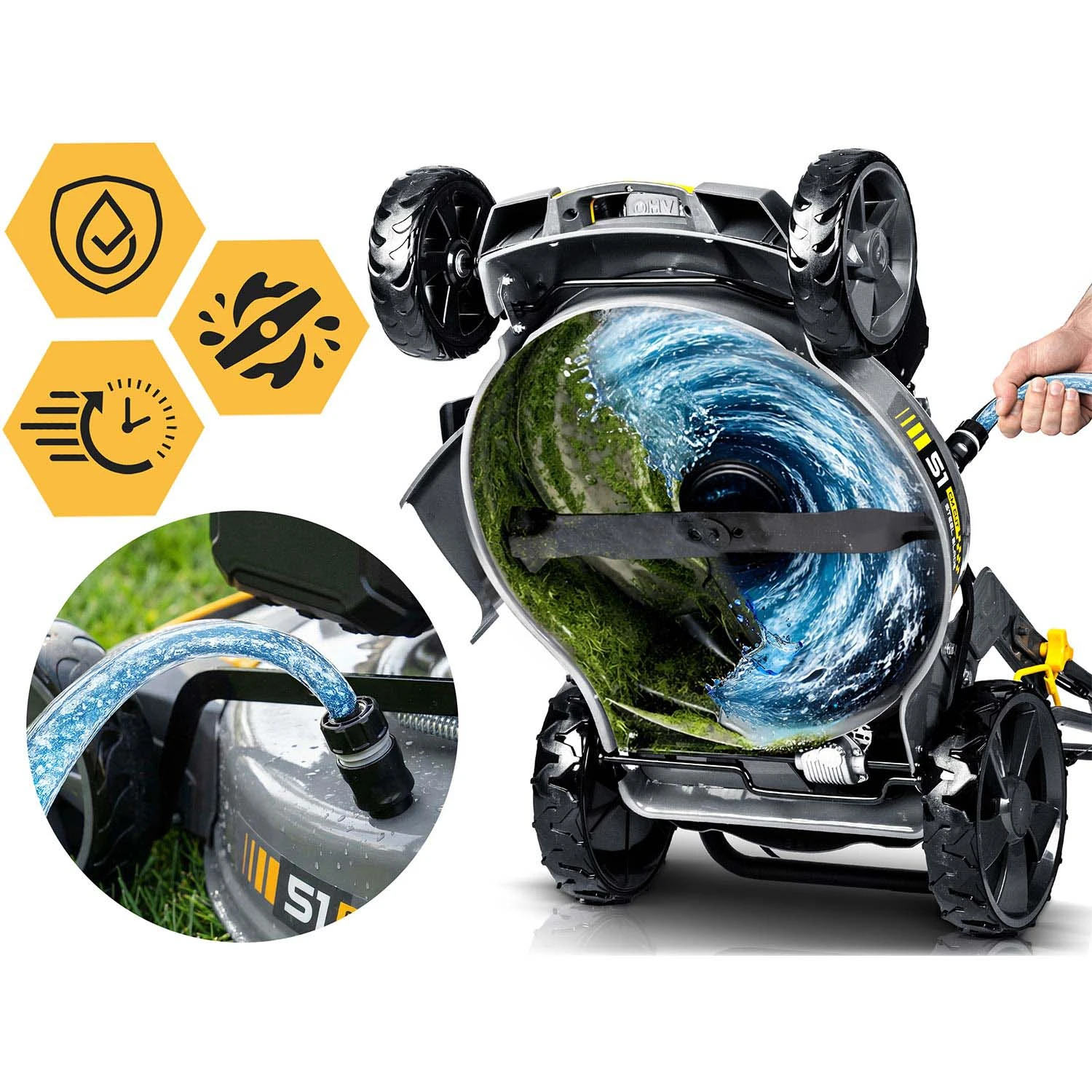 Wbudowane przyłącze do węża ogrodowego umożliwia dokładne wypłukanie wnętrza kosiarki bez demontażu i ręcznego czyszczenia.