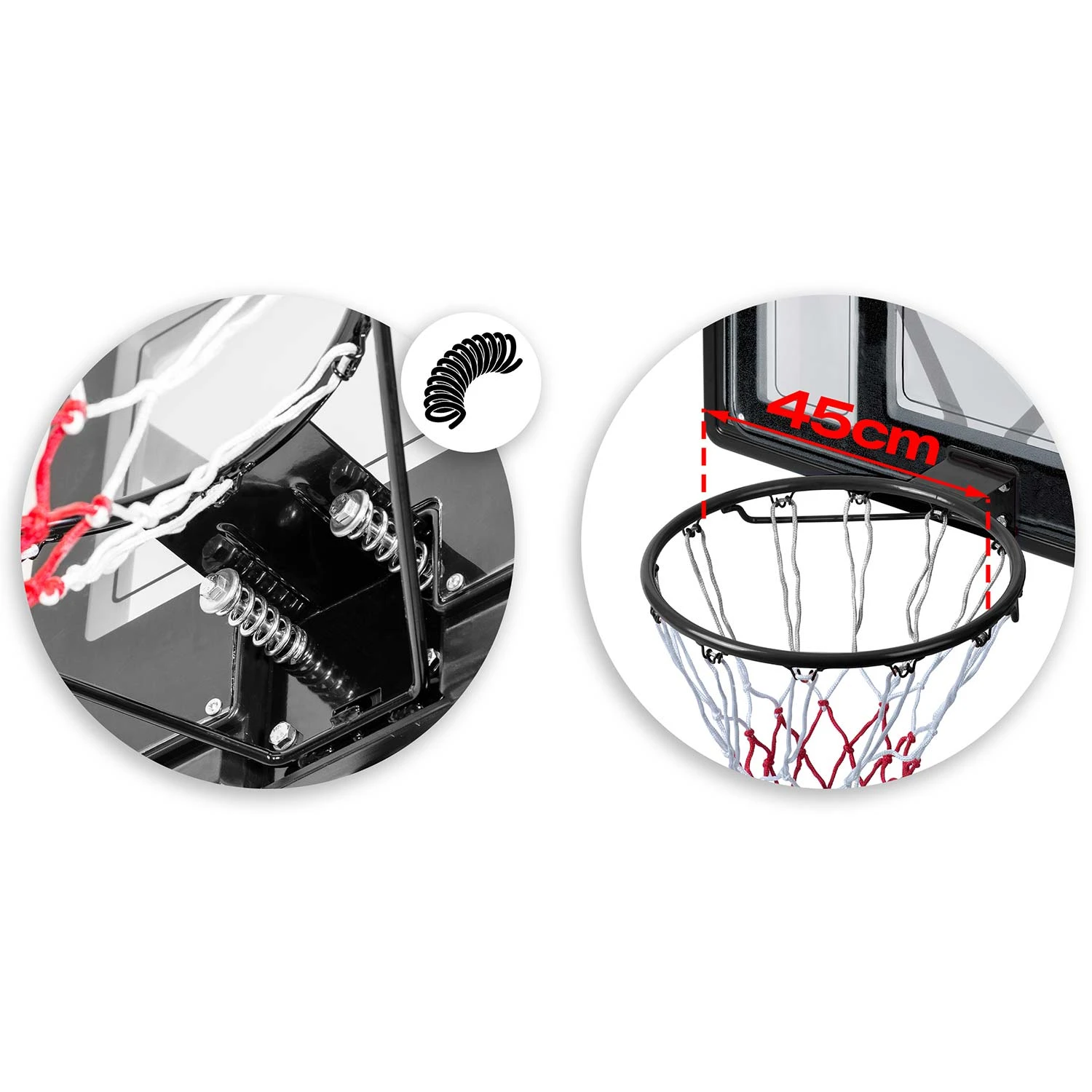 Obręcz w standardzie meczowym 45 cm i tablica ze wzmocnionego przezroczystego PVC — wygląd, odbicie i wytrzymałość jak z hali.
