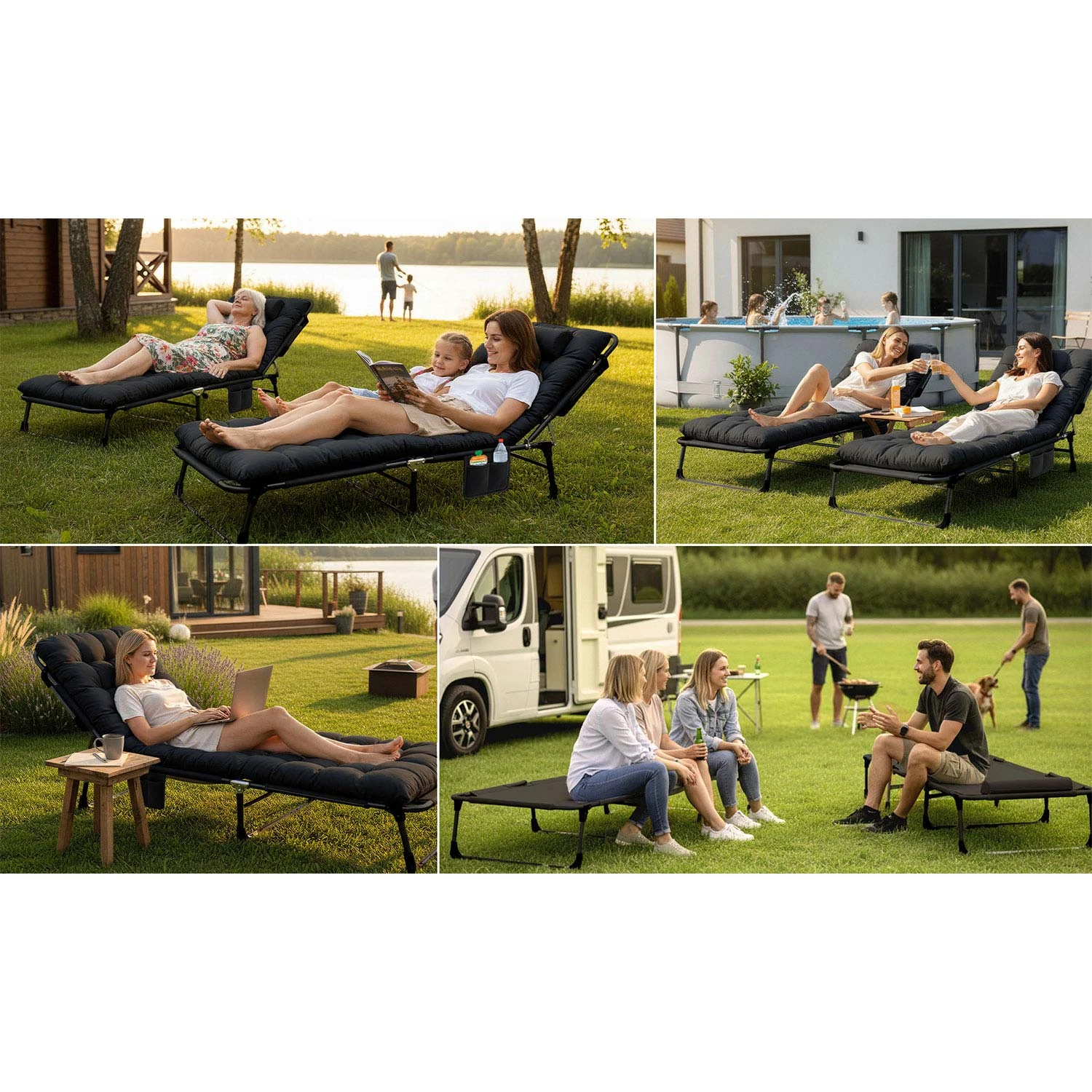 Uniwersalny, czarny kolor sprawia, że składane łóżko-leżak świetnie pasuje zarówno do ogrodu, jak i na działkę czy biwak.