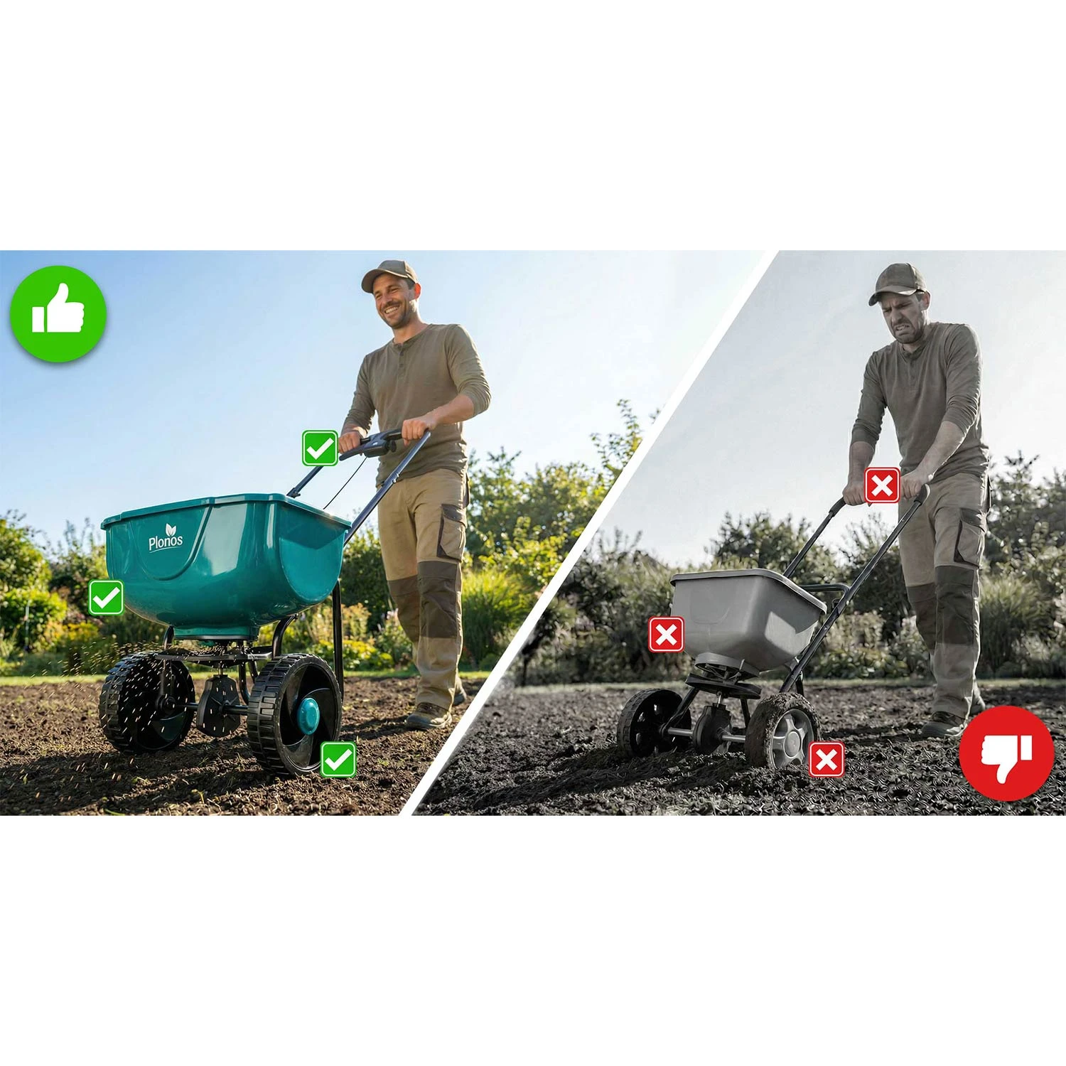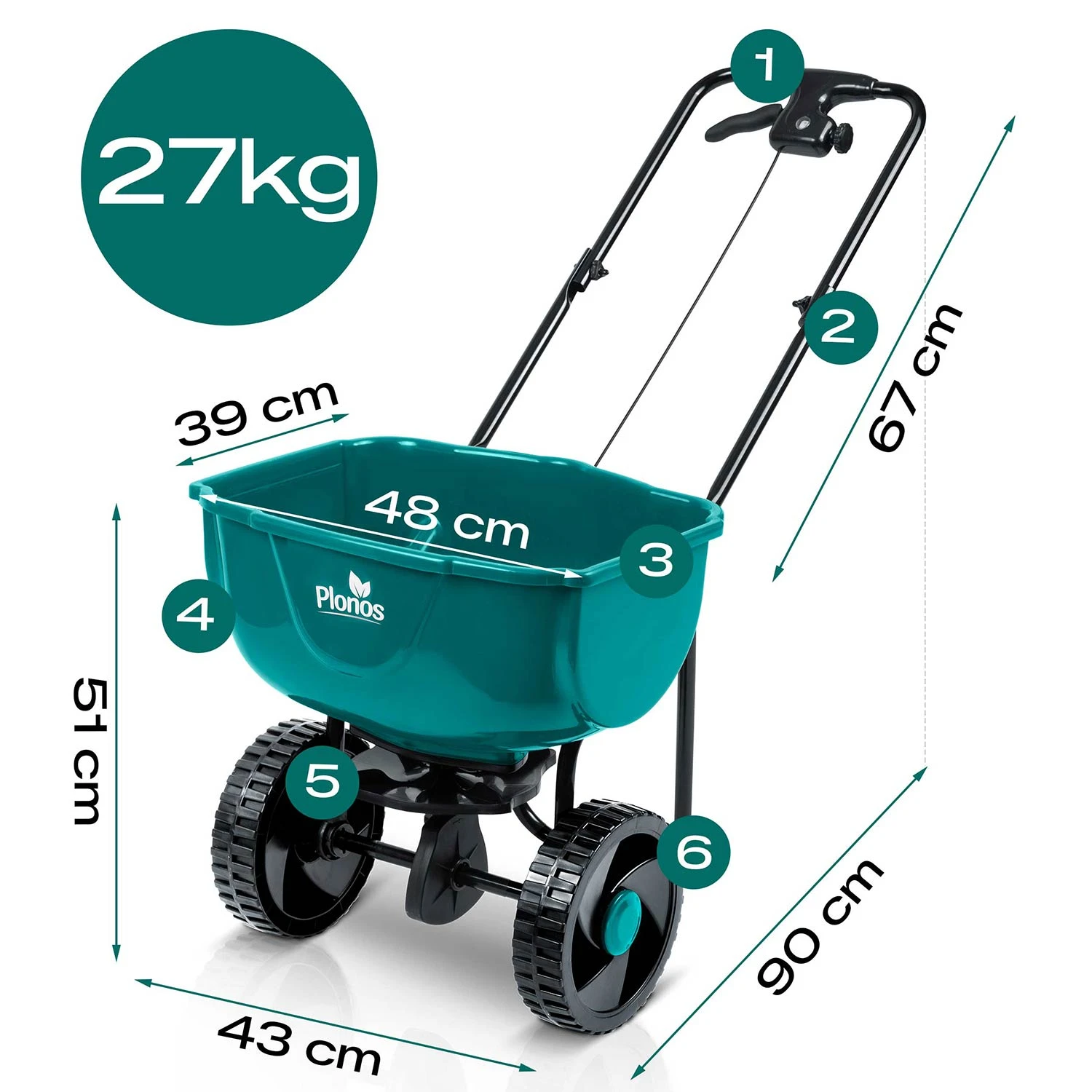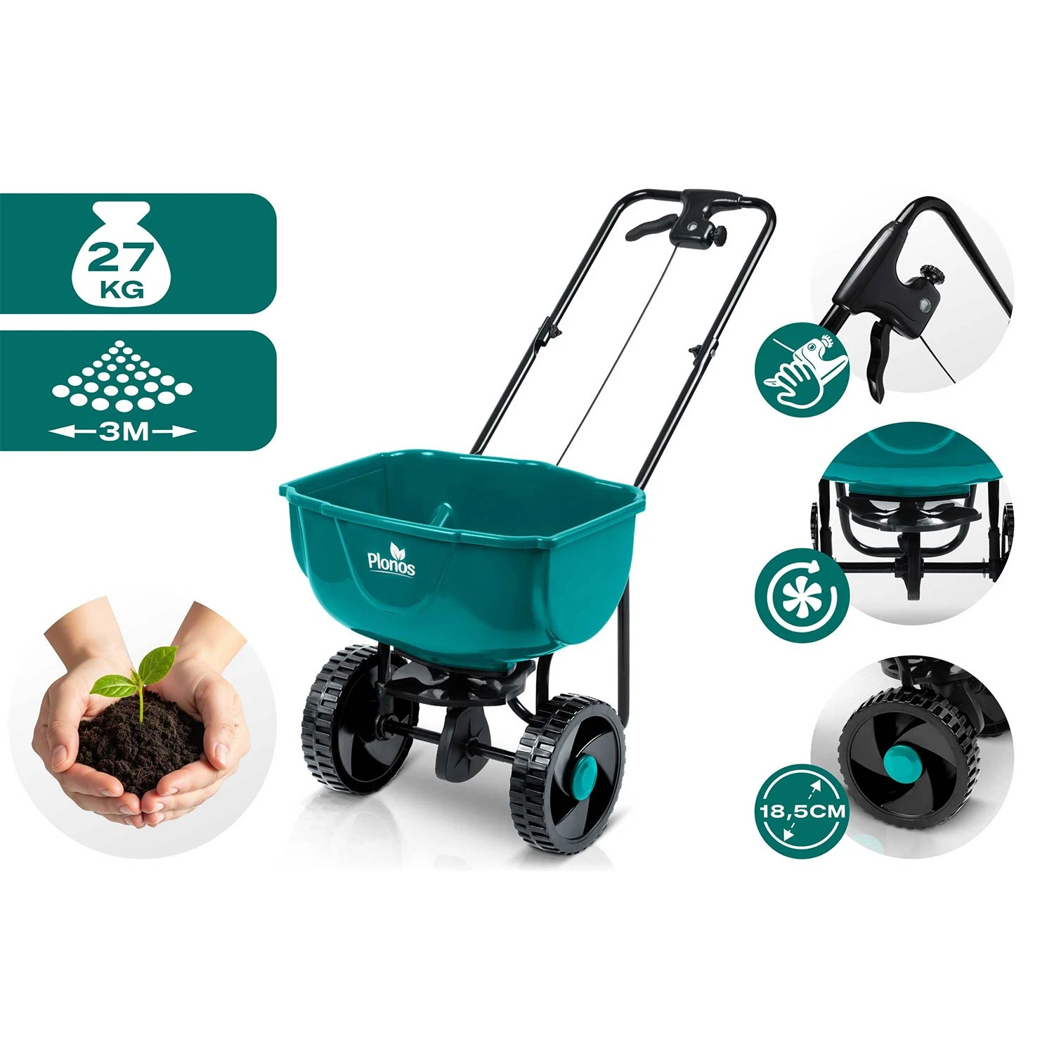 Siewnik Plonos 27 l zapewnia szeroki zakres aplikacji, aż do 300 cm, umożliwiając szybkie pokrycie większych powierzchni.