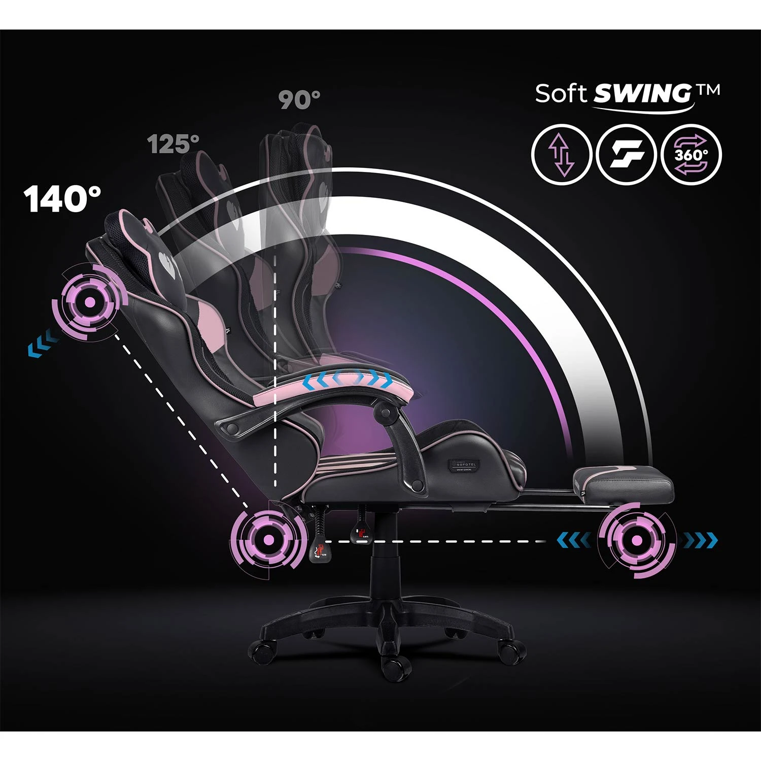 Mechanizm Soft SWING™ pozwala na płynne odchylenie oparcia nawet do 140°, dając Ci swobodę zmiany pozycji w trakcie gry i relaksu. Pracujesz w 90°, odpoczywasz w 125°, regenerujesz w 140° — bez szarpnięć, bez luzów, z pełną stabilnością.