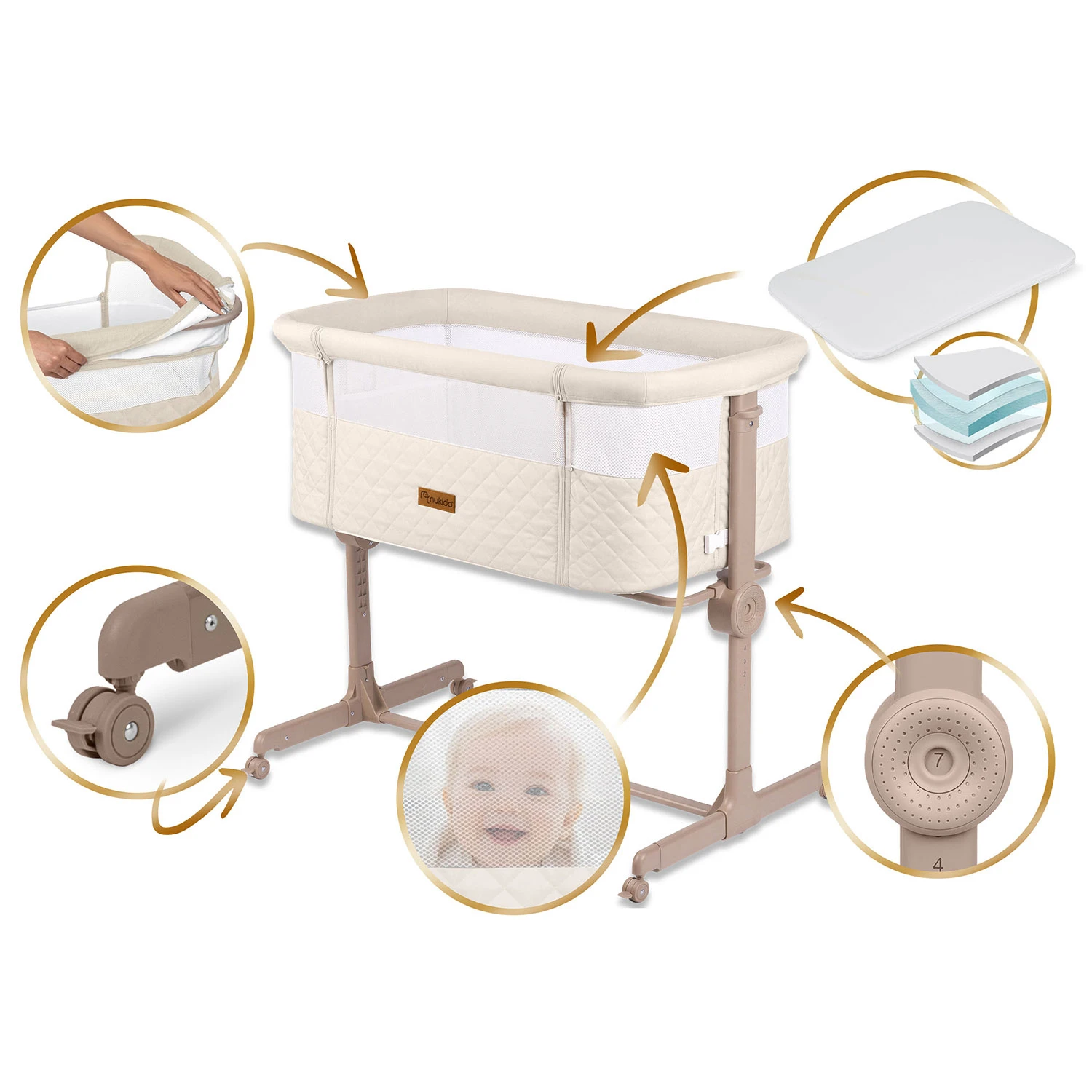 Łóżeczko dostawne umożliwia matce łatwe karmienie w nocy, bez konieczności wstawania i przechodzenia do innego pokoju. Dzięki regulacji łatwo dostosujesz wysokość łóżeczka do twojego materaca.