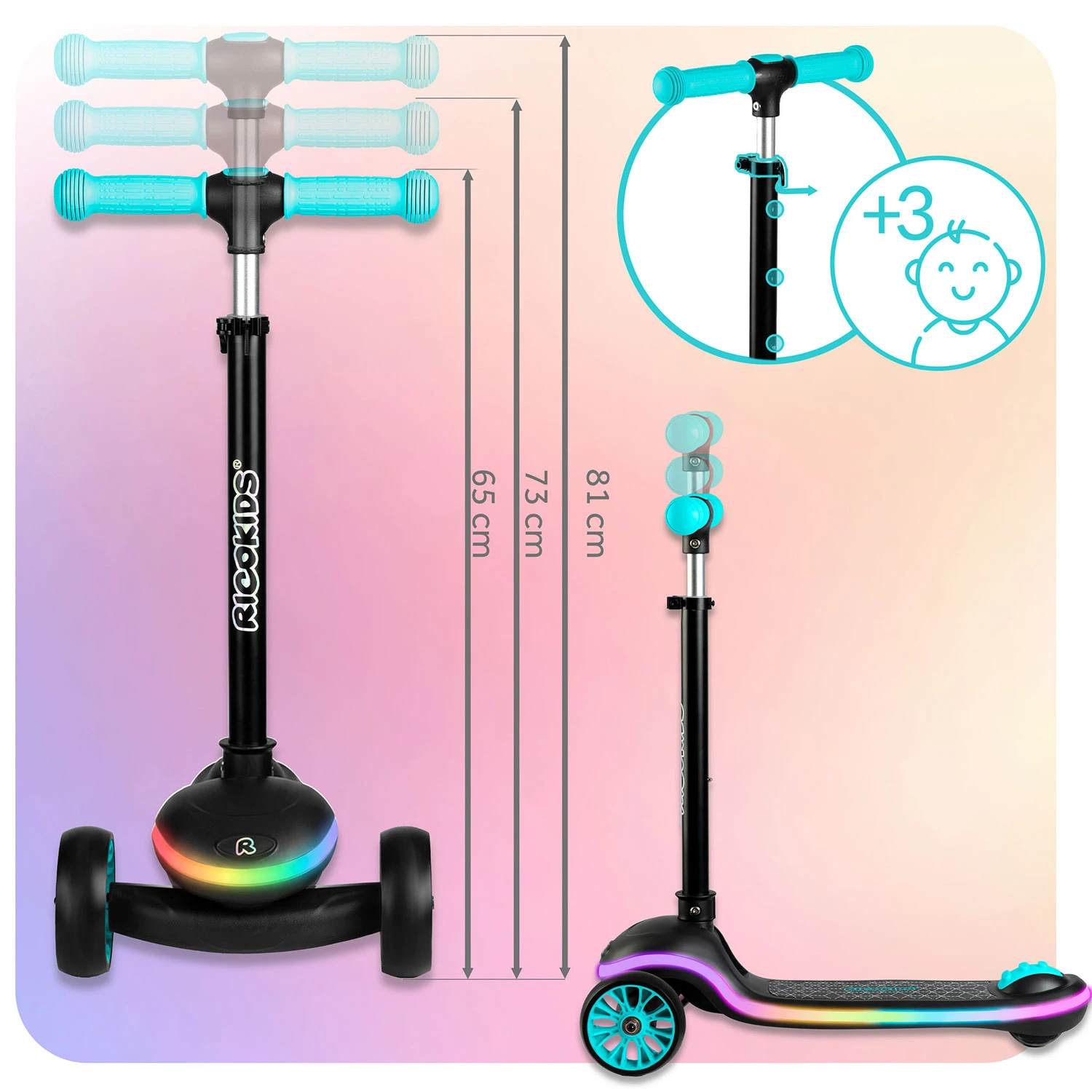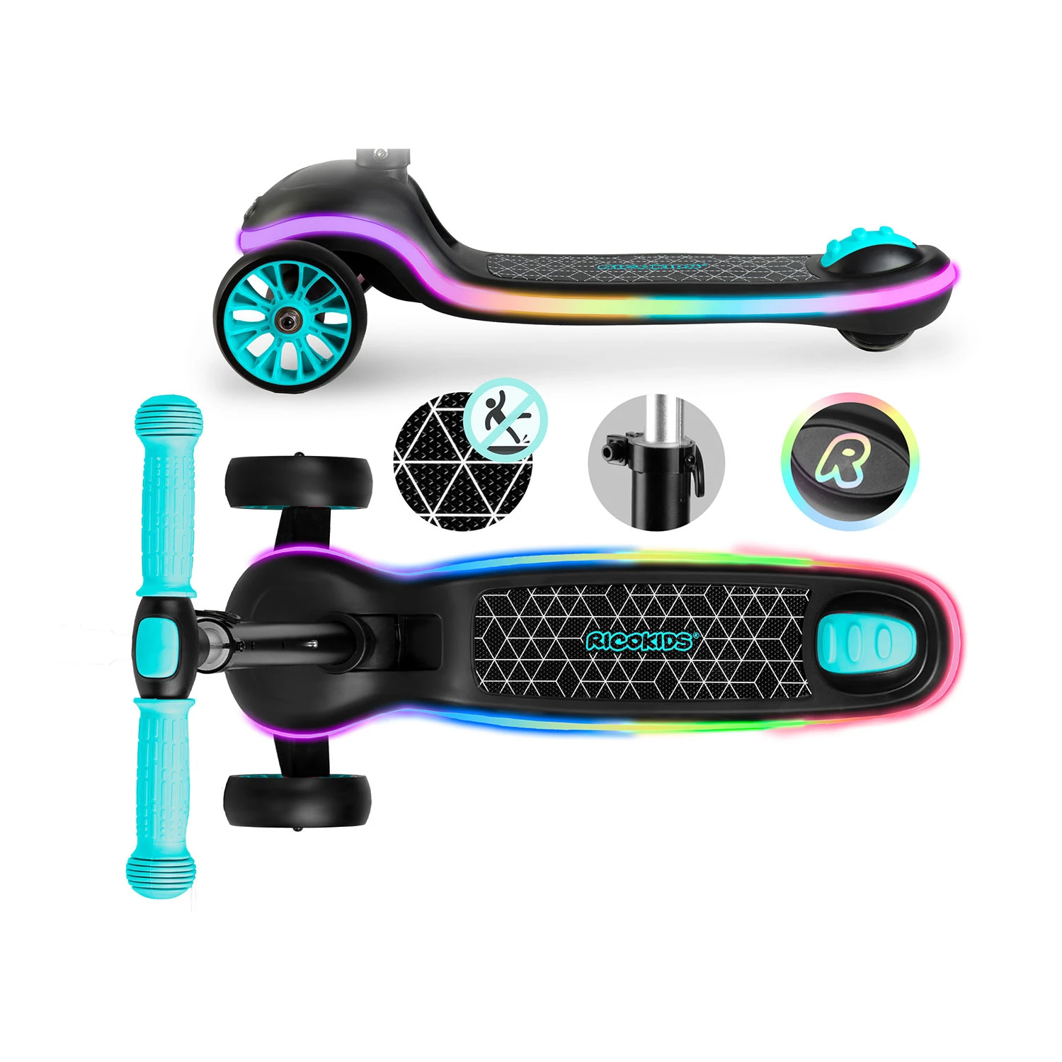 Hulajnoga Ricokids Leddi to świetna propozycja dla aktywnych dzieci. Zwrotna i lekka konstrukcja zapewnia wygodną jazdę, a dodatkowo posiada podświetlany podest LED z 20 trybami.