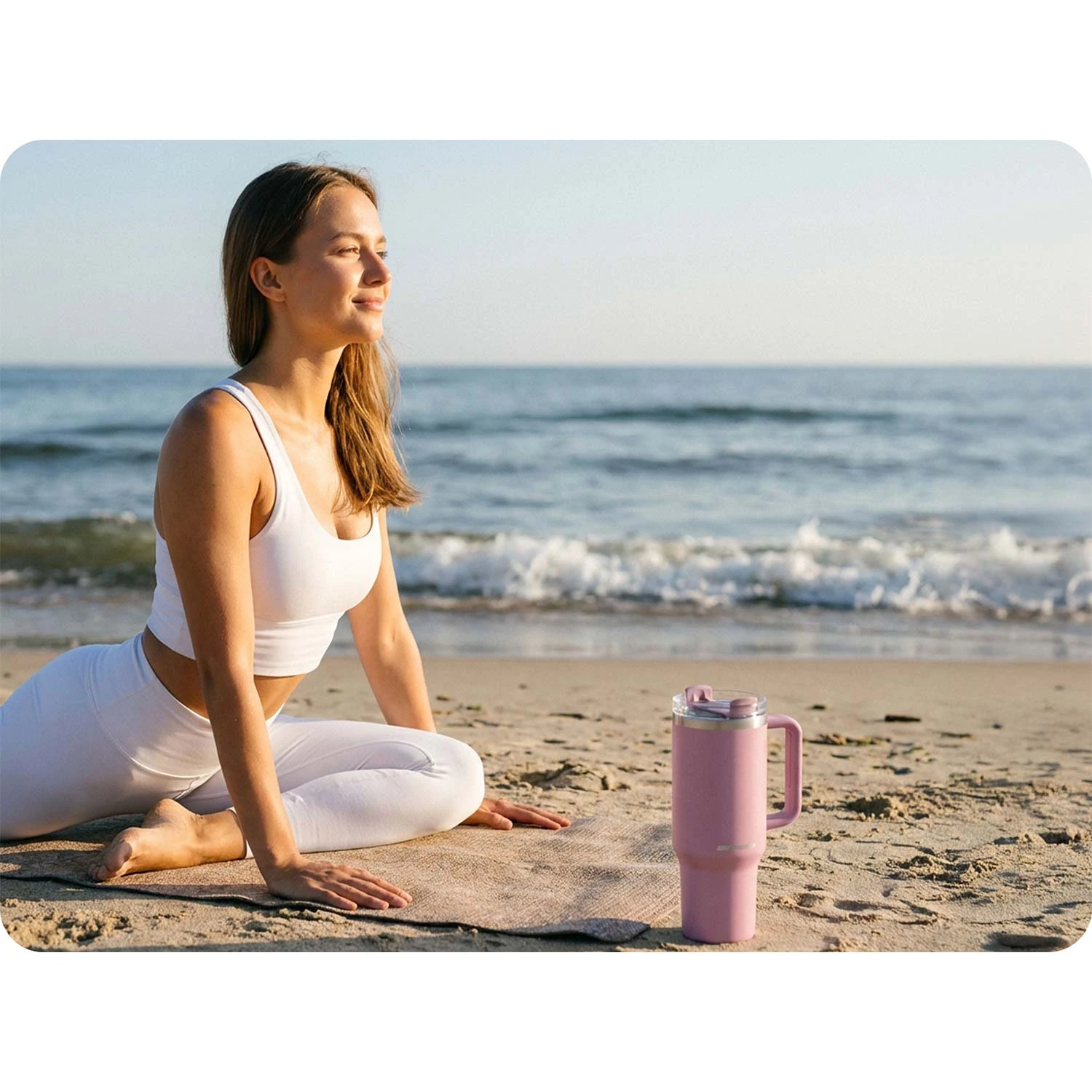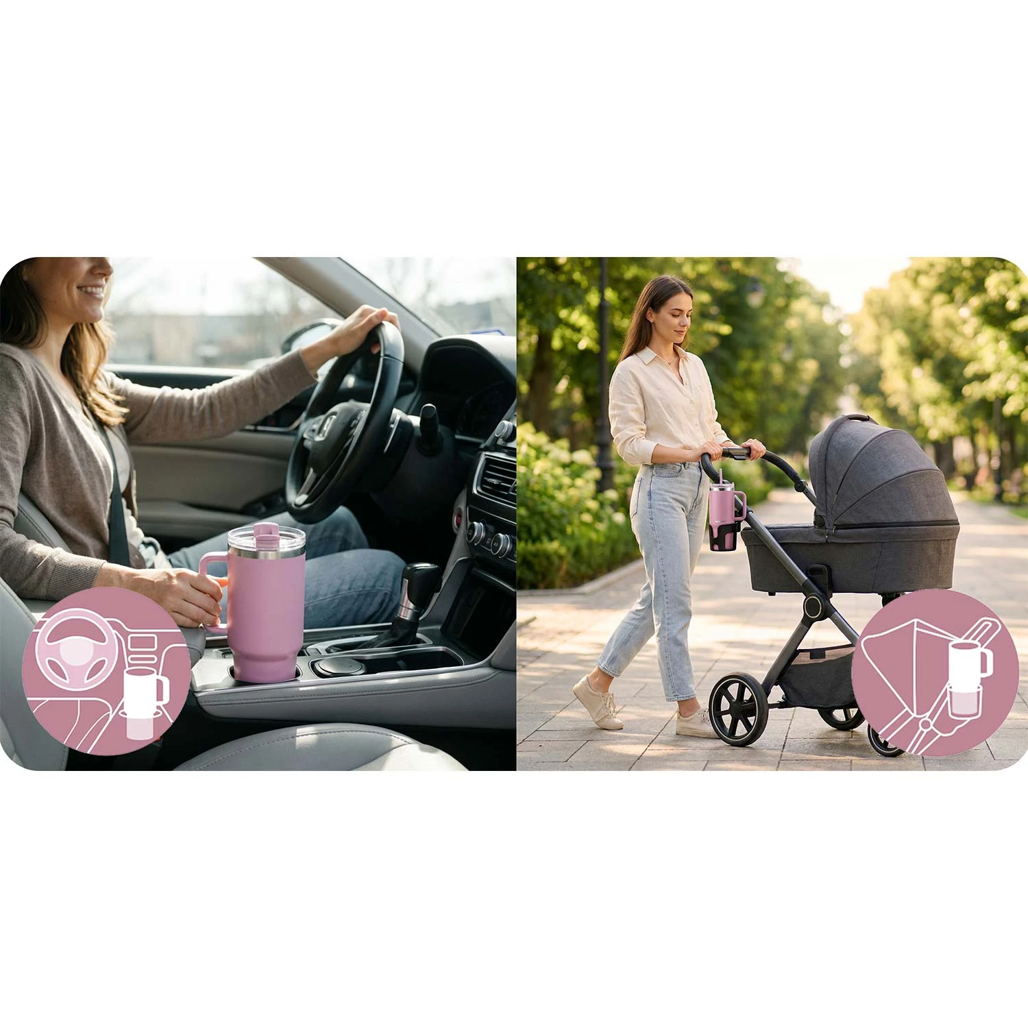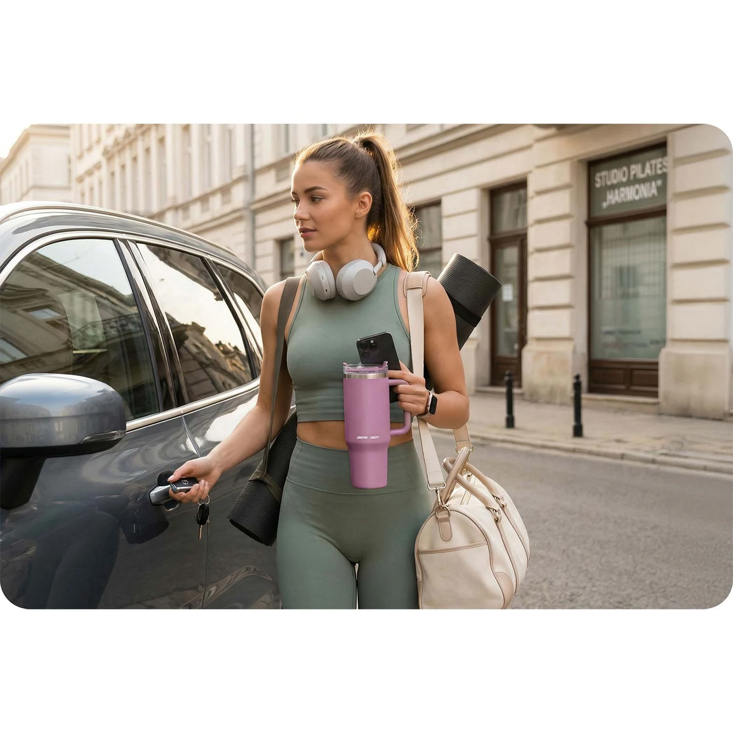 Pomimo dużej pojemności 1180 ml, specjalne wklęśnięcie w dolnej części sprawia, że kubek bez problemu mieści się w standardowych uchwytach (cupholderach), zapewniając stabilność podczas jazdy.