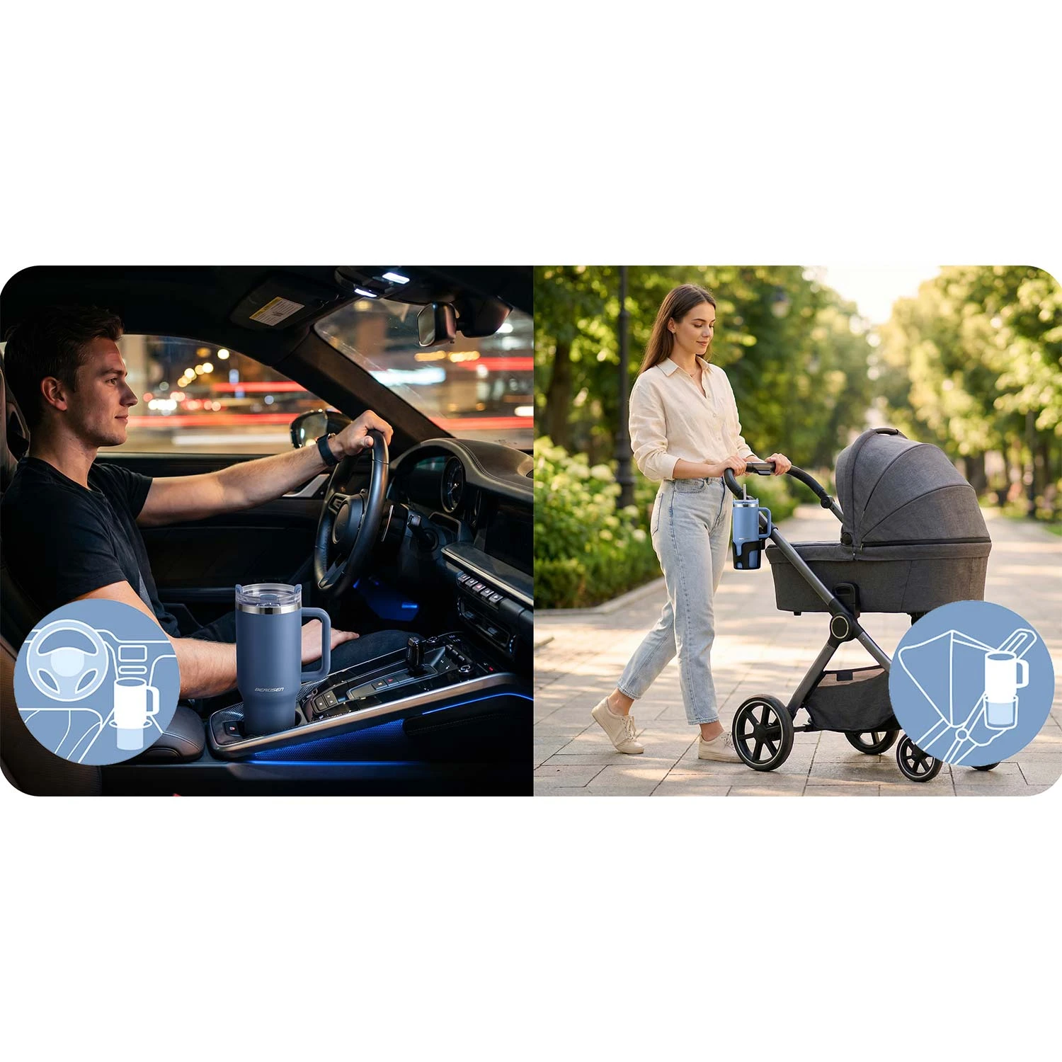 Specjalnie wyprofilowana podstawa sprawia, że kubek stabilnie pasuje do większości uchwytów samochodowych – bezpiecznie i wygodnie podczas jazdy.